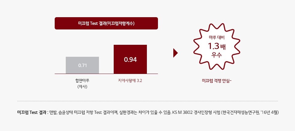 지아사랑애 3.2는 마루 대비 약 1.3배 우수한 미끄럼 방지 효과를 보입니다.
