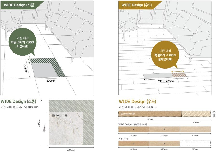 넓어진 나무쪽 크기로 시원시원한 공간 연출이 가능하며,