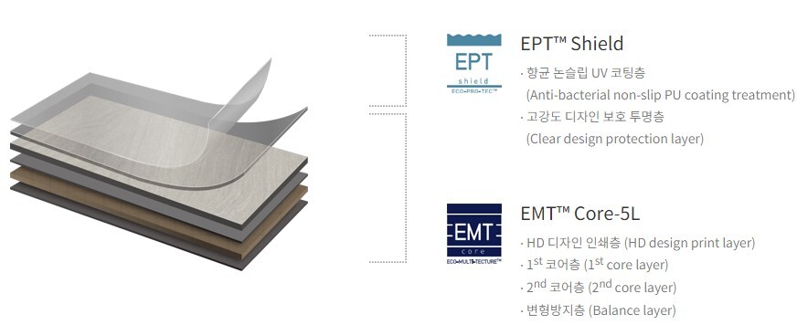 녹수의 EPT™ Shield 프리미엄 무광 코팅 공법과 EMT™ Core 다층구조 공법이 적용되어 치수가 안정되어 있고 견고합니다. 또한 EPT™ Shield 공법시 사용되는 향균재료는 미국 EPA 인증을 받아안전성이 입증되었습니다.