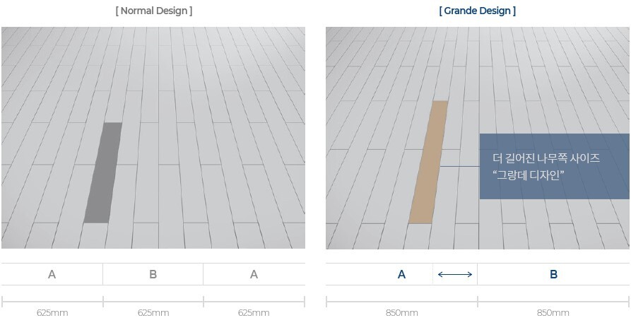 더 길어진 나무쪽 사이즈의 ‘그랑데 디자인’을 적용하여 시원시원한 공간 연출 가능