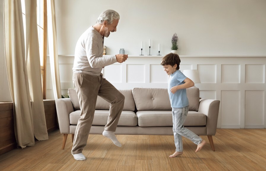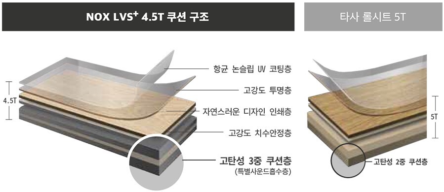 국내 최초로 고탄성 3중 쿠션층을 기존 2중 쿠션층을 가진 제품의 두께보다 20% 더 얇은 두께에 적용해 낸 바닥재로 기대를 뛰어넘는 충격 흡수와 제품의 복원성을 구현해냈습니다.
