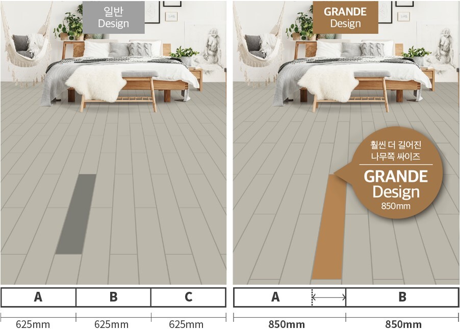 훨씬 더 길어진 나무쪽 사이즈의 ‘GRANDE Design’을 적용하여, 시원시원한 공간 연출이 가능하며,패턴에 꼭 맞는 입체 엠보를 적용하여 나무, 돌 등의 소재감이 살아 납니다