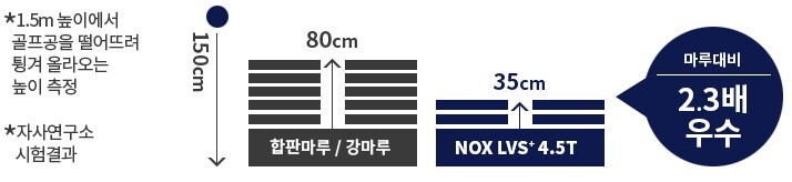 녹수 LVS+는 마루대비 약 2.3배 충격 흡수가 뛰어납니다. 녹수만의 EMT™ Core Technology가 적용된촘촘한 고밀도 쿠션층이 보행 시 발생하는 충격을 흡수해 주고, 뛰어난 보행감을 선사합니다.