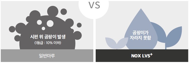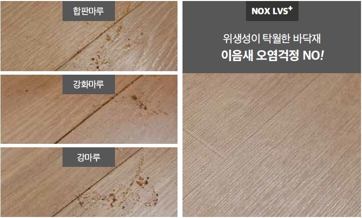 청소가 쉽고, 긁힘과 찍힘, 변색과 오염에 강한 NOX LVS+만의 EPT™ Shield 코팅 기술을 기본으로,고급스러운 질감 표현을 위해 ‘프리미엄 자연무광’을 추가하여 바닥재 최초로 적용한,이전에 없던 새로운 프리미엄 시트 바닥재입니다.